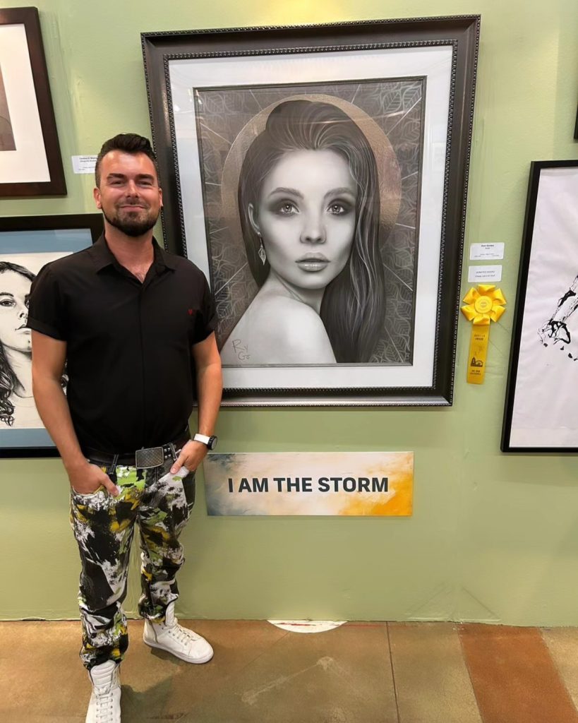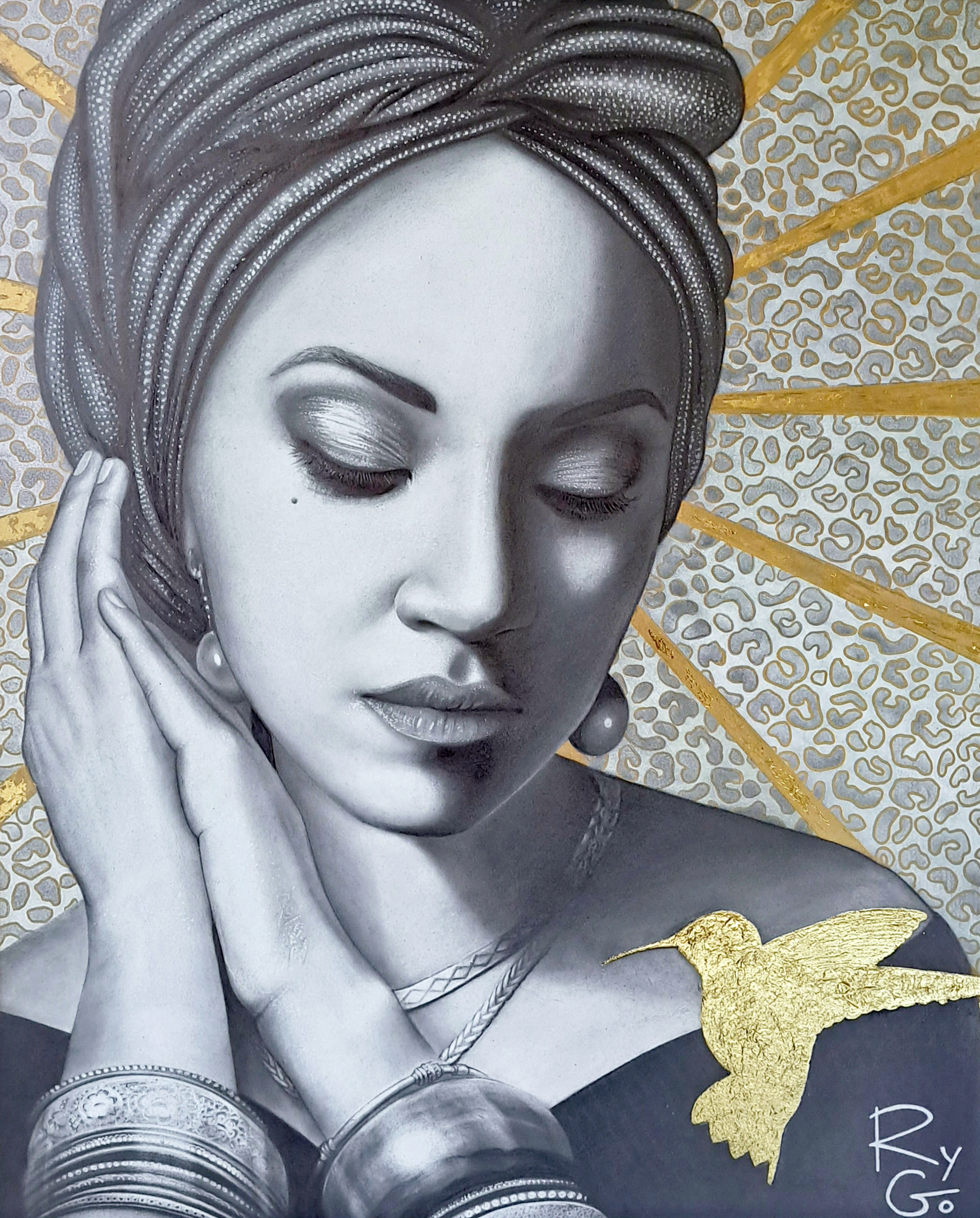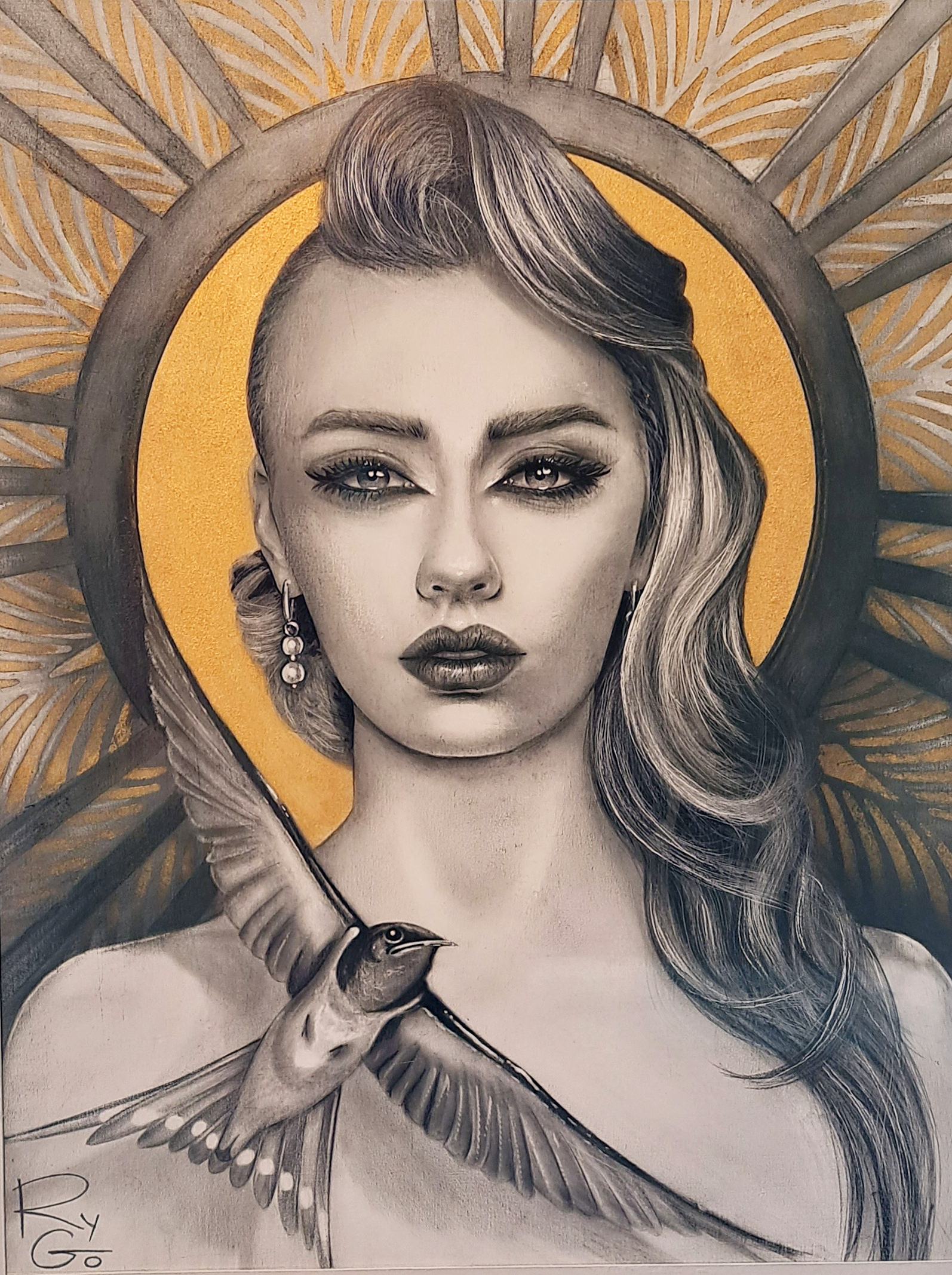 Ryan’s work beautifully blends realism and fantasy, inviting viewers into a world where ethereality takes center stage. By using a monochromatic palette with metallic accents, he creates a striking contrast that enhances the dreamlike quality of his subjects. Each piece becomes a dialogue between the tangible and the transcendent, encouraging a deeper emotional connection and reflection from those who engage with his art. Each portrait serves as a profound exploration of character, weaving in symbolic connections to celestial deities.